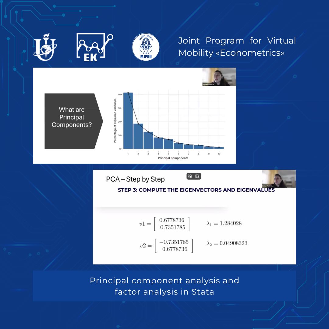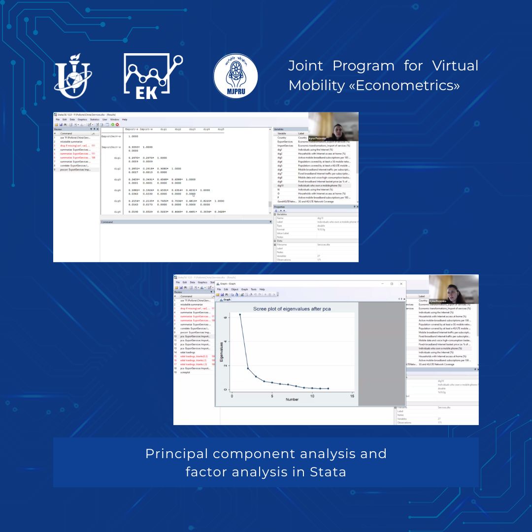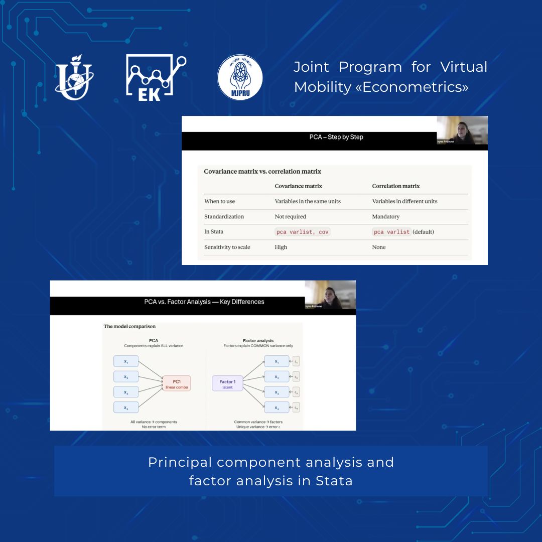 🧩 During the lecture, the logic behind methods for reducing data dimensionality and identifying factors influencing economic processes was explained in detail. Iryna Viktorivna demonstrated a step-by-step algorithm for implementing PCA and factor analysis in the Stata environment, paying particular attention to: