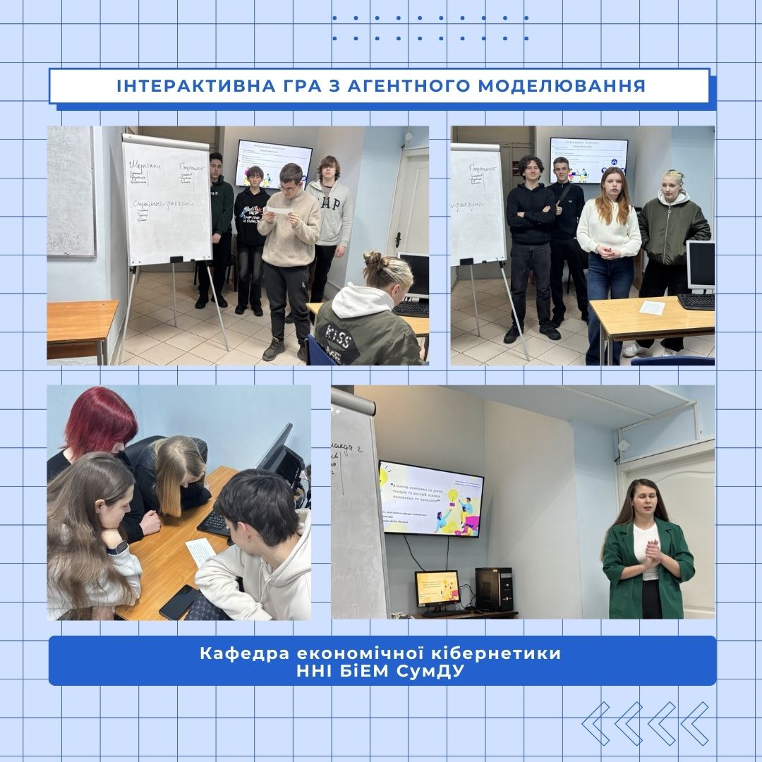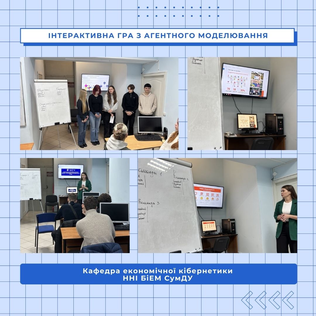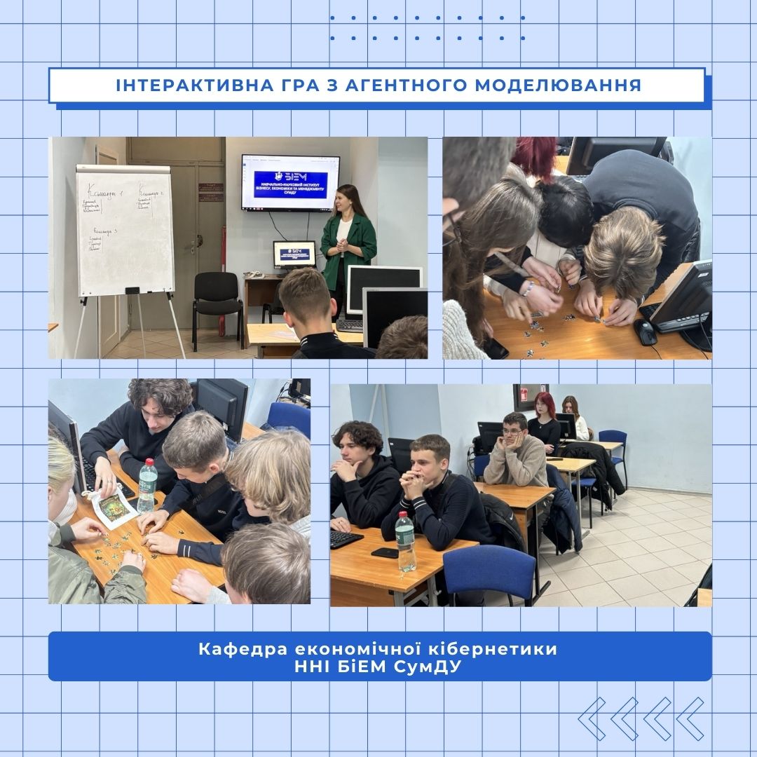 On March 6 2026, Alina Yefimenko, assistant professor at the Department of Economic Cybernetics, conducted an interactive game as part of the agent-based modeling course. Fifteen tenth-grade students from Sumy Secondary School No. 27 and Sumy City Council Secondary School No. 2 participated in the event.