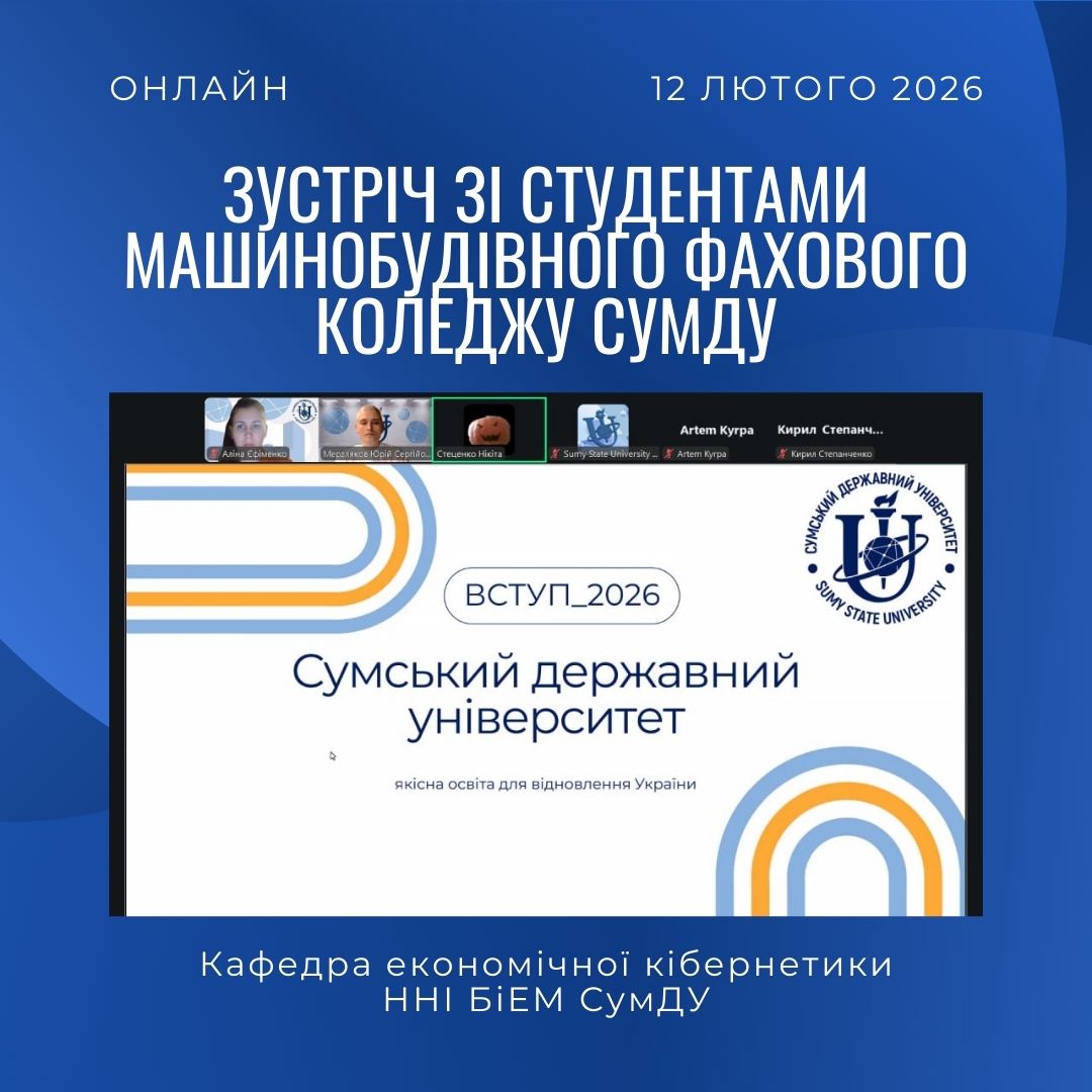 On February 12, 2026, an online meeting was held with parents and students of the 3rd and 4th years of the Machine Building Technical College of Sumy State University of all specialties. During the event, the head of the Center for Pre-University Education gave a general presentation on Sumy State University’s position in the rankings, forms of education, international academic mobility, conditions and terms of the 2026 entrance exams.