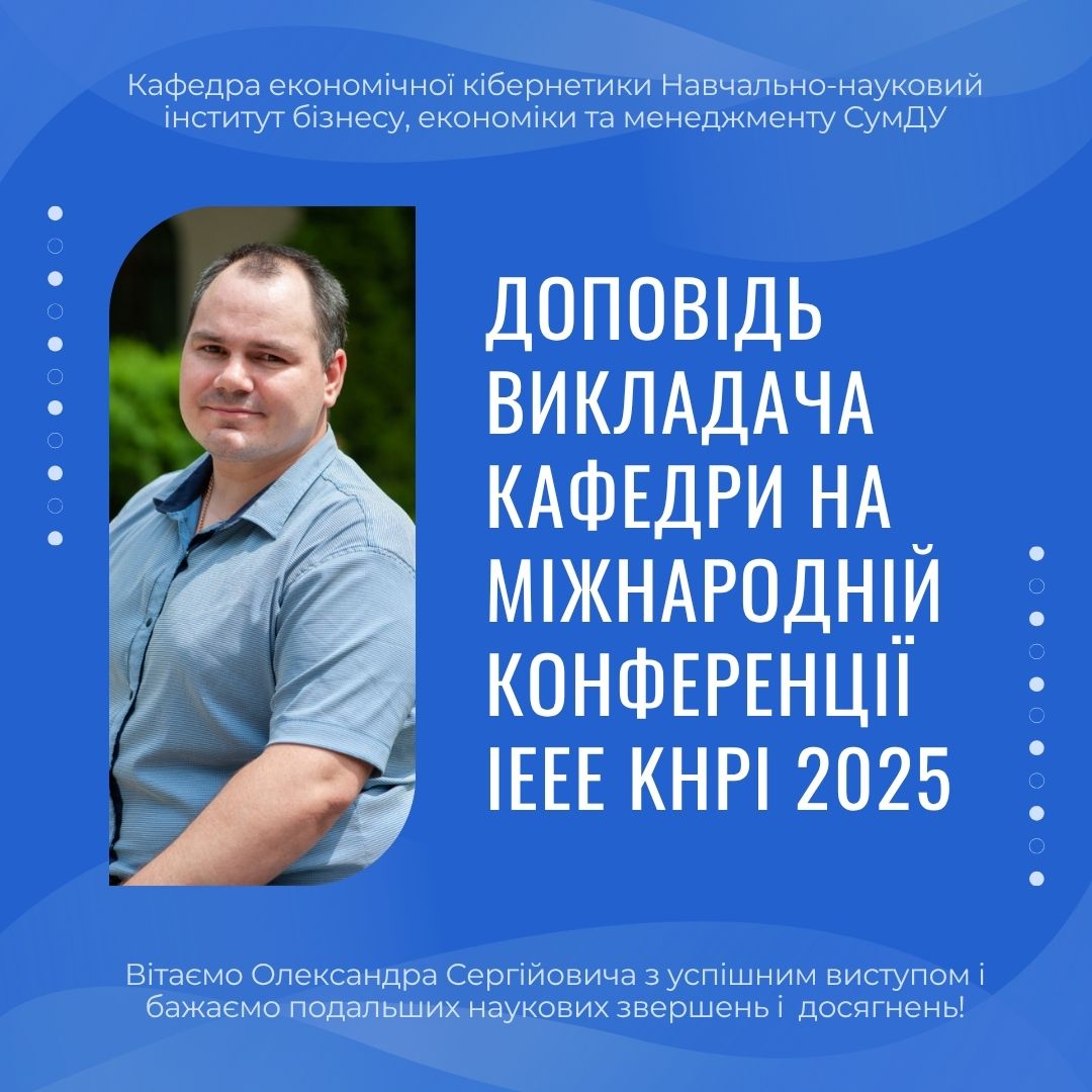 From October 6 to 10, 2025, Oleksandr S. Kushnerov, a Senior Lecturer at the Department of Economic Cybernetics, successfully presented the results of his research at the prestigious international conference, the IEEE 6th KhPI Week on Advanced Technology (KhPIWeek). The event brought together leading scientists and experts to discuss the latest achievements in the field of advanced technologies.