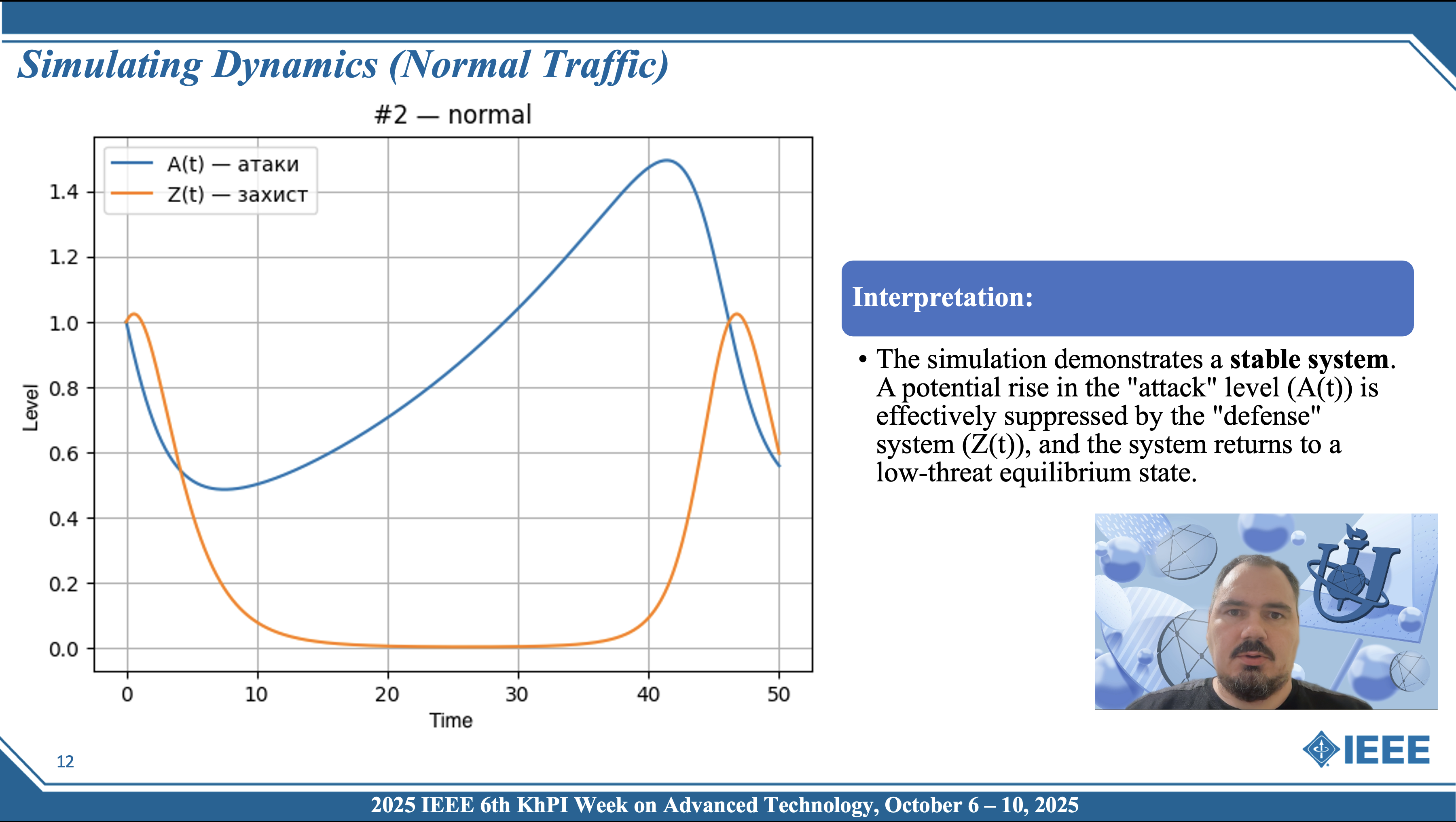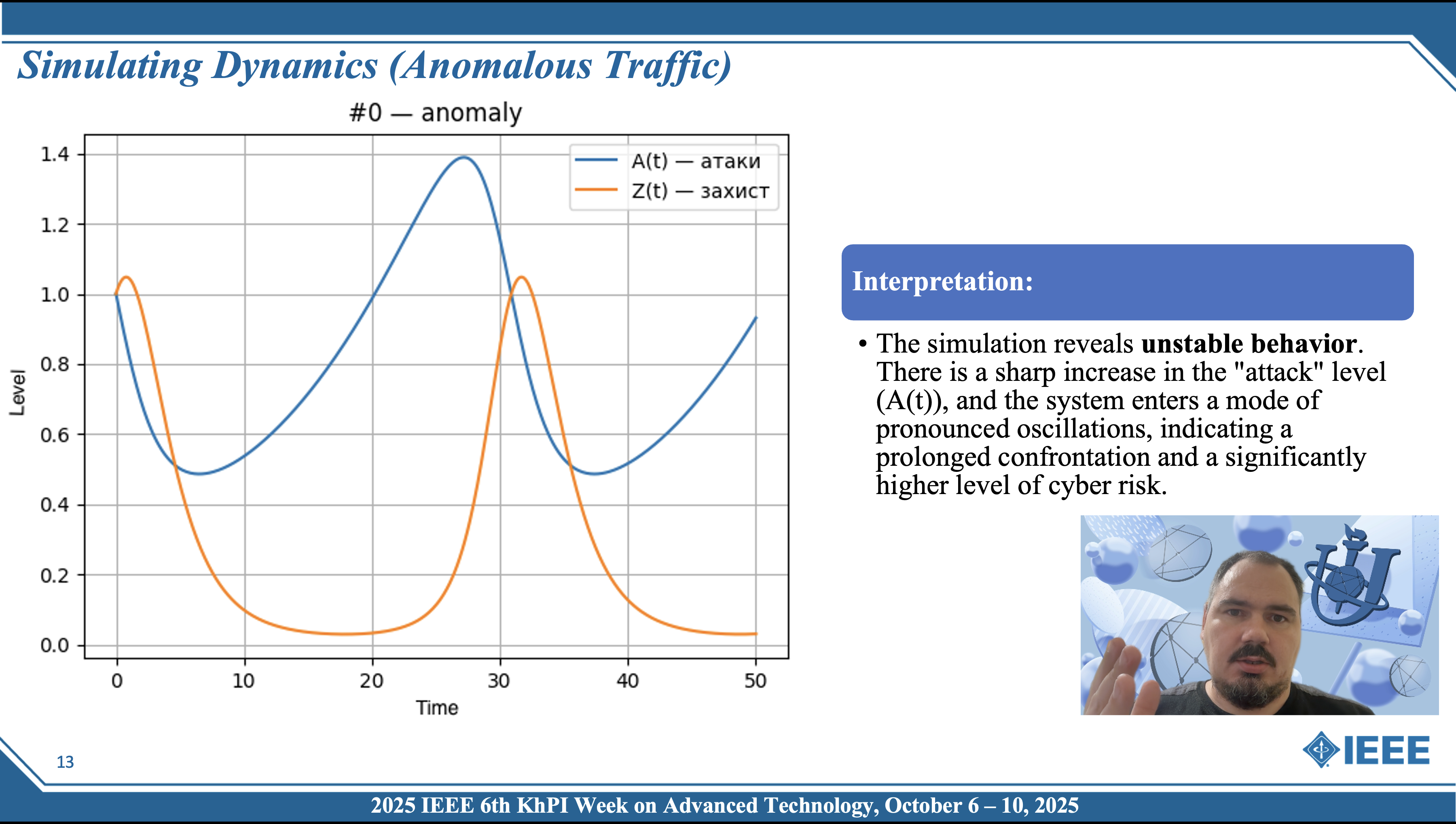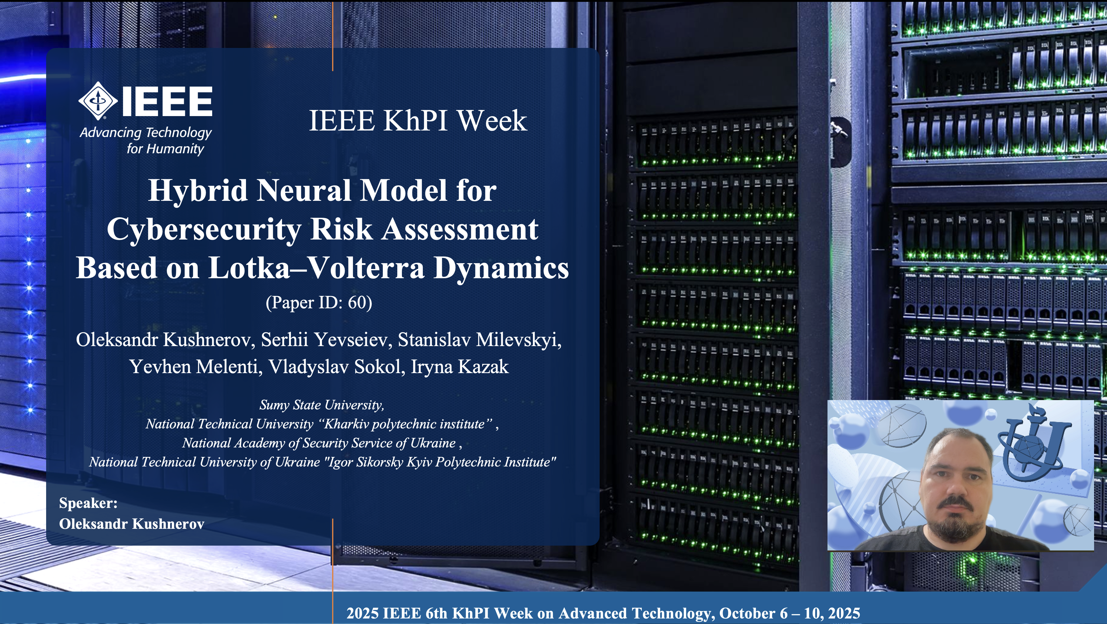 Oleksandr delivered a presentation on the topic “Hybrid Neural Model for Cybersecurity Risk Assessment Based on Lotka–Volterra Dynamics.” In his work, he proposed an approach to assessing cyber risks that combines deep neural networks for classifying network activity with the Lotka-Volterra dynamical model for simulating the interaction between threats and defensive mechanisms.