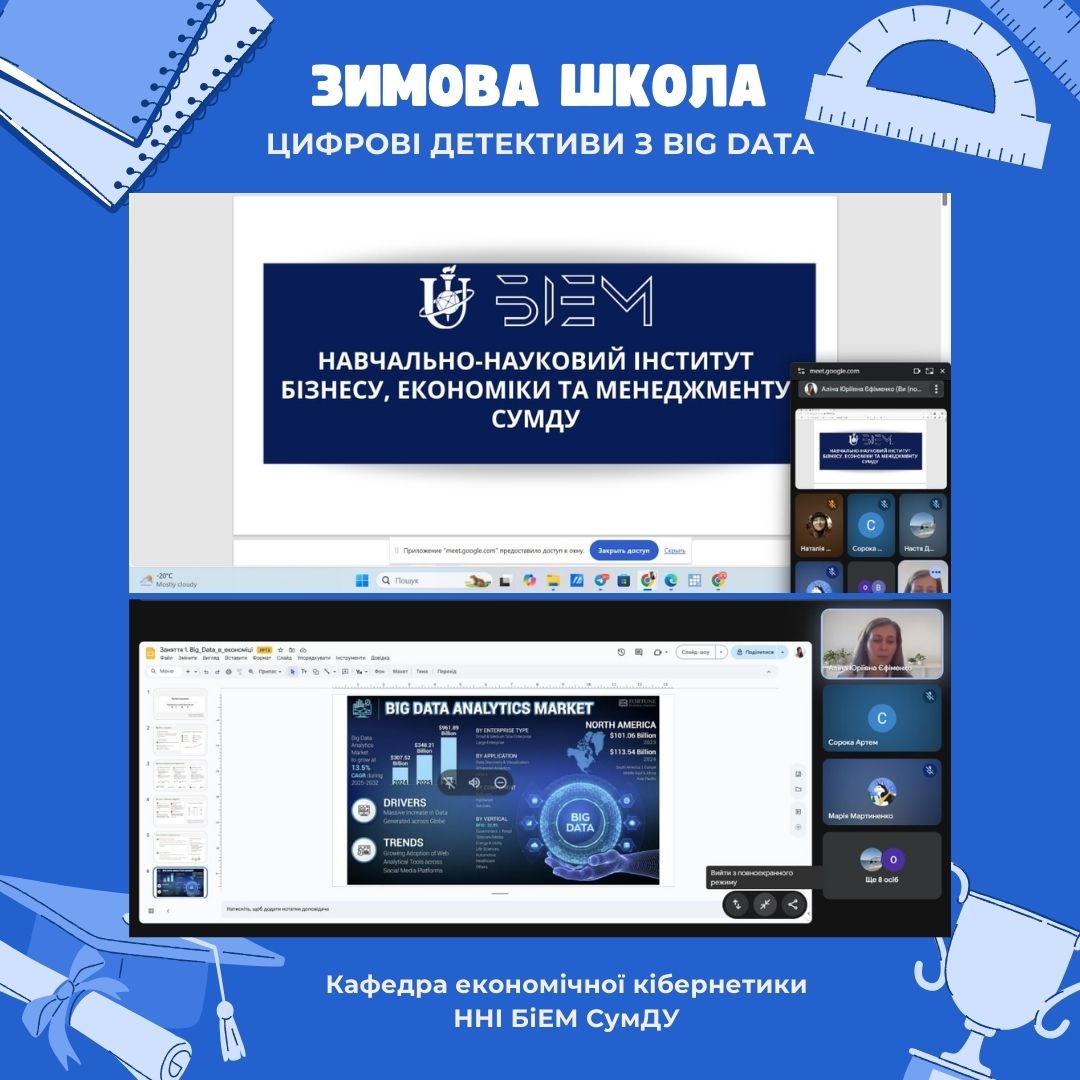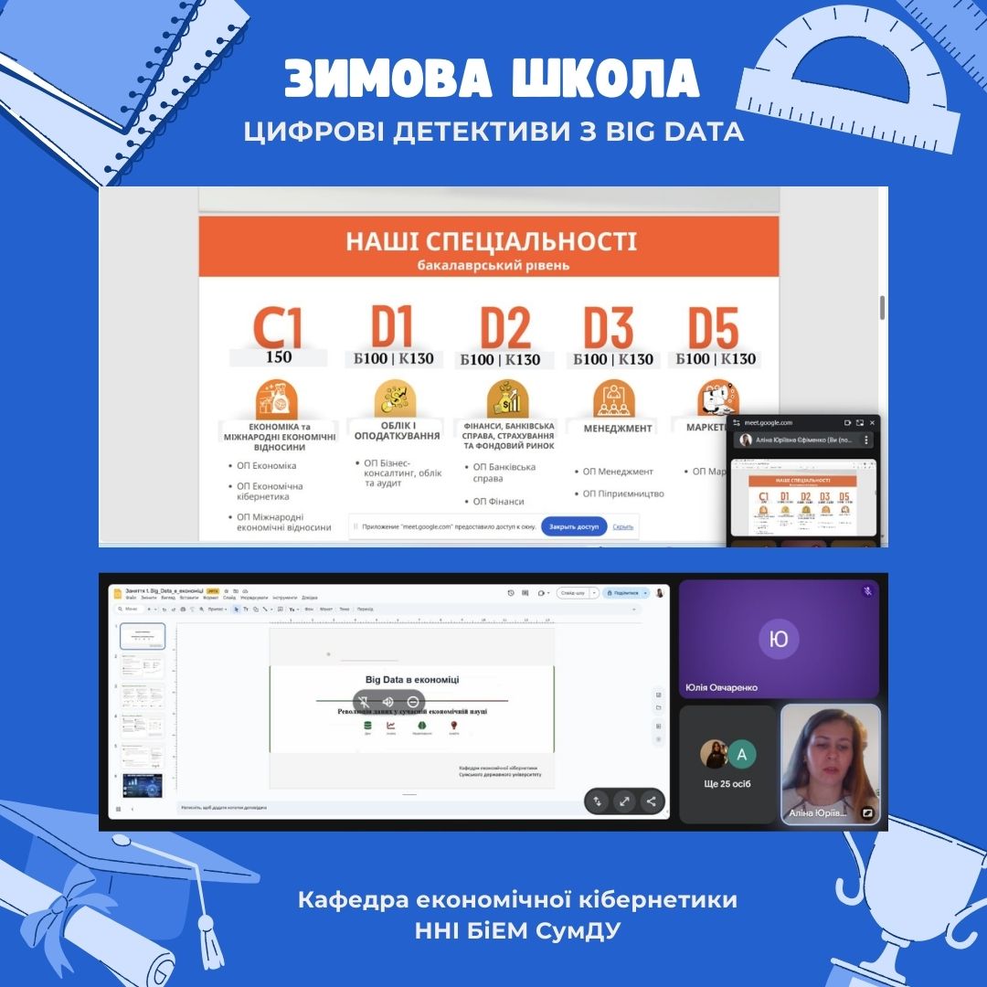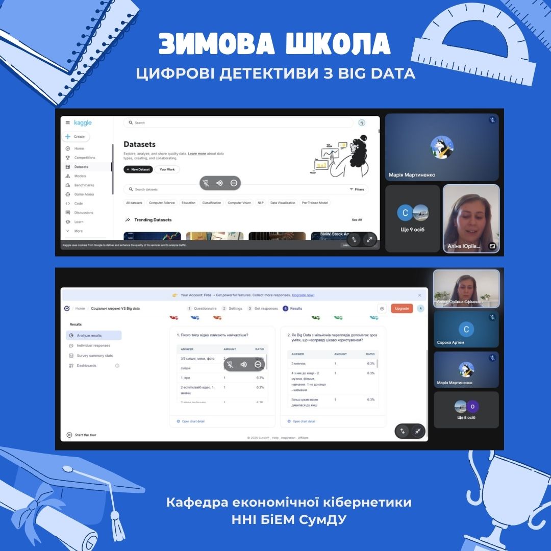 2 лютого 2026 року у рамках Зимової школи «Цифрові детективи з Big data” було проведено дві інтерактивні онлайн-лекції «Цифрові детективи: Big data у твоєму телефоні»📈. Заходи було проведено асистенткою кафедри економічної кібернетики Єфіменко Аліною Юріївною. Заходи зібрали 37 школярів. Учні 9-А та 9-В класів Сумської ЗЗСО №15 СМР змогли зануритися в світ Big data з використанням сучасних інформаційних технологій та пограти у інтерактив-опитування “Соціальні мережі VS Big data”